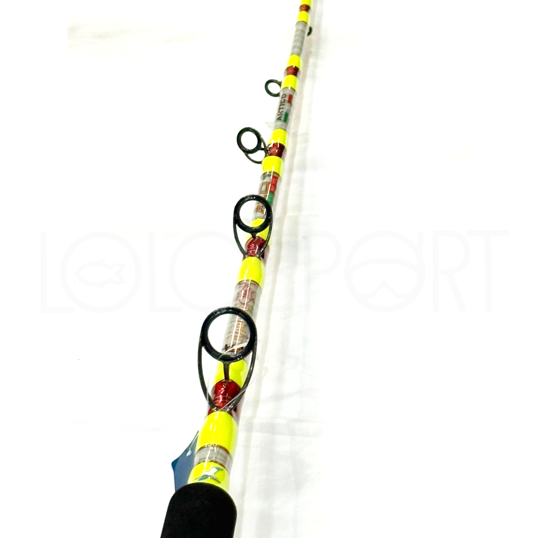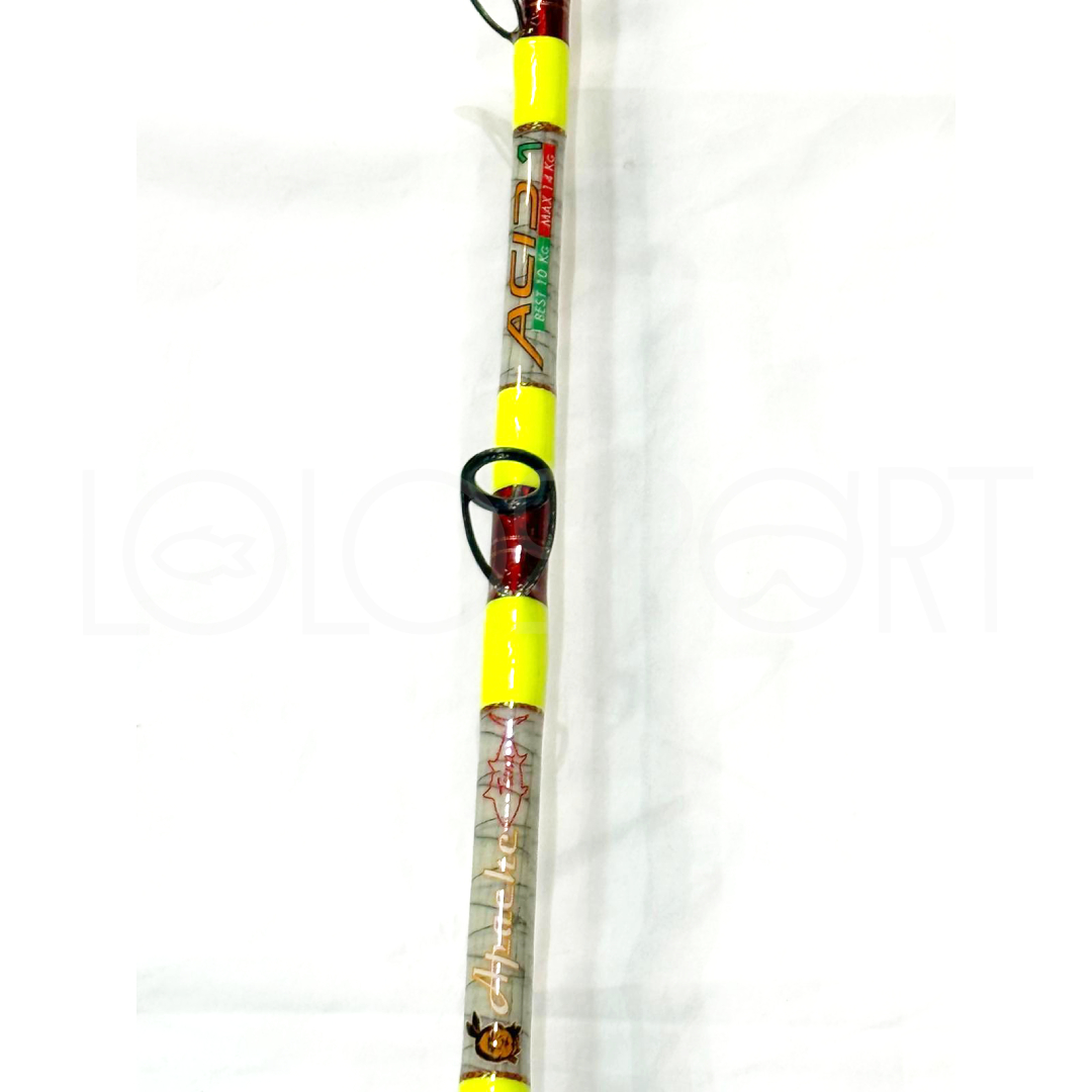 Questa Artico Apache Acid 1 Super Custom è allestita con anelli Fuji Faz Lite, manico curvo Alps custom rosso, impugnatura in EVA e una finitura estetica di grande impatto, con legature giallo fluo su sottolegatura rossa, per un risultato unico, aggressivo ed estremamente raffinato.