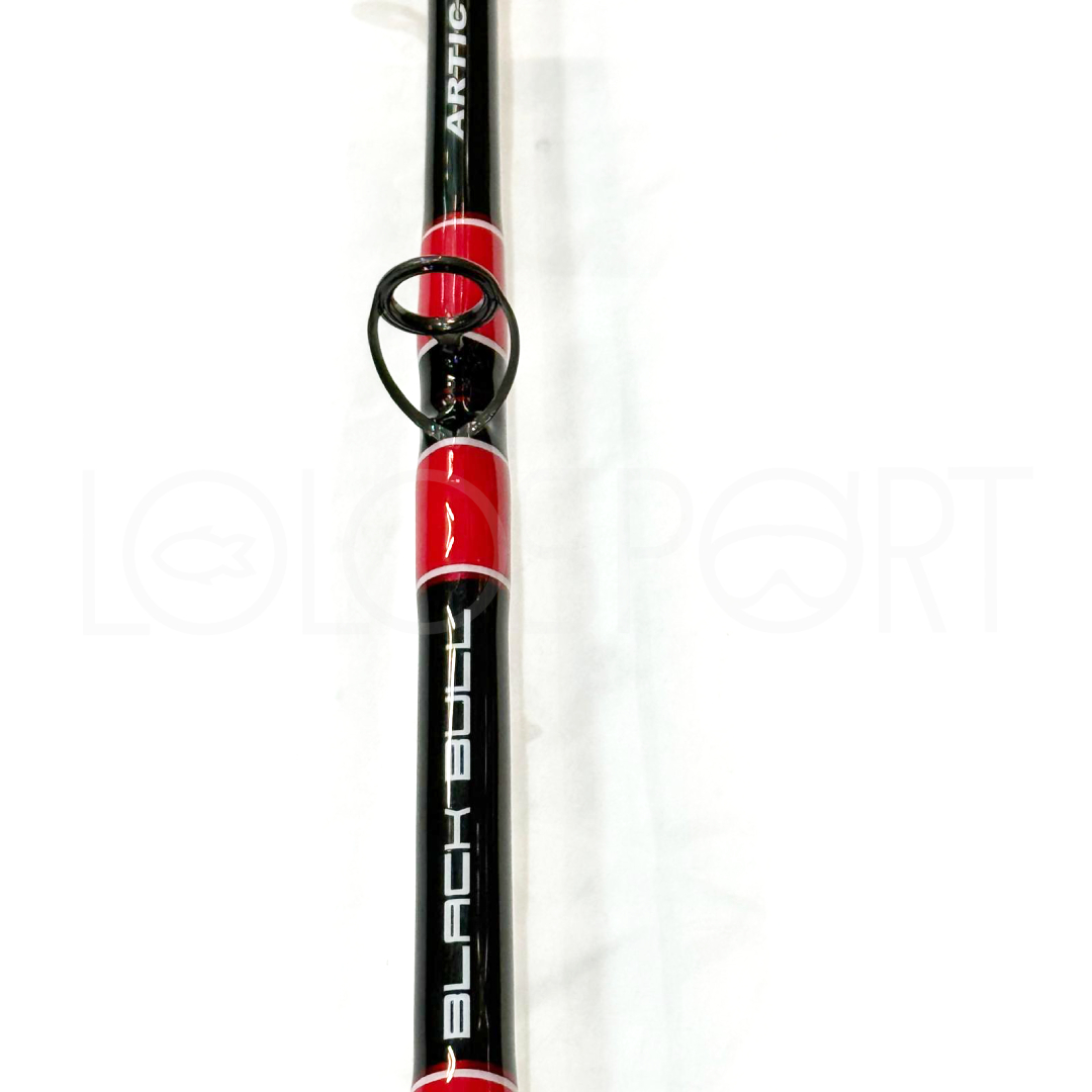 Questa Artico Black Bull Acid è allestita con montaggio Acid, anelli Fuji Faz Lite, impugnatura in EVA e una raffinata estetica total black impreziosita da legature rosse e da una splendida legatura tiger decorativa, unica nel suo genere, che dona al fusto un carattere distintivo e di altissimo livello.