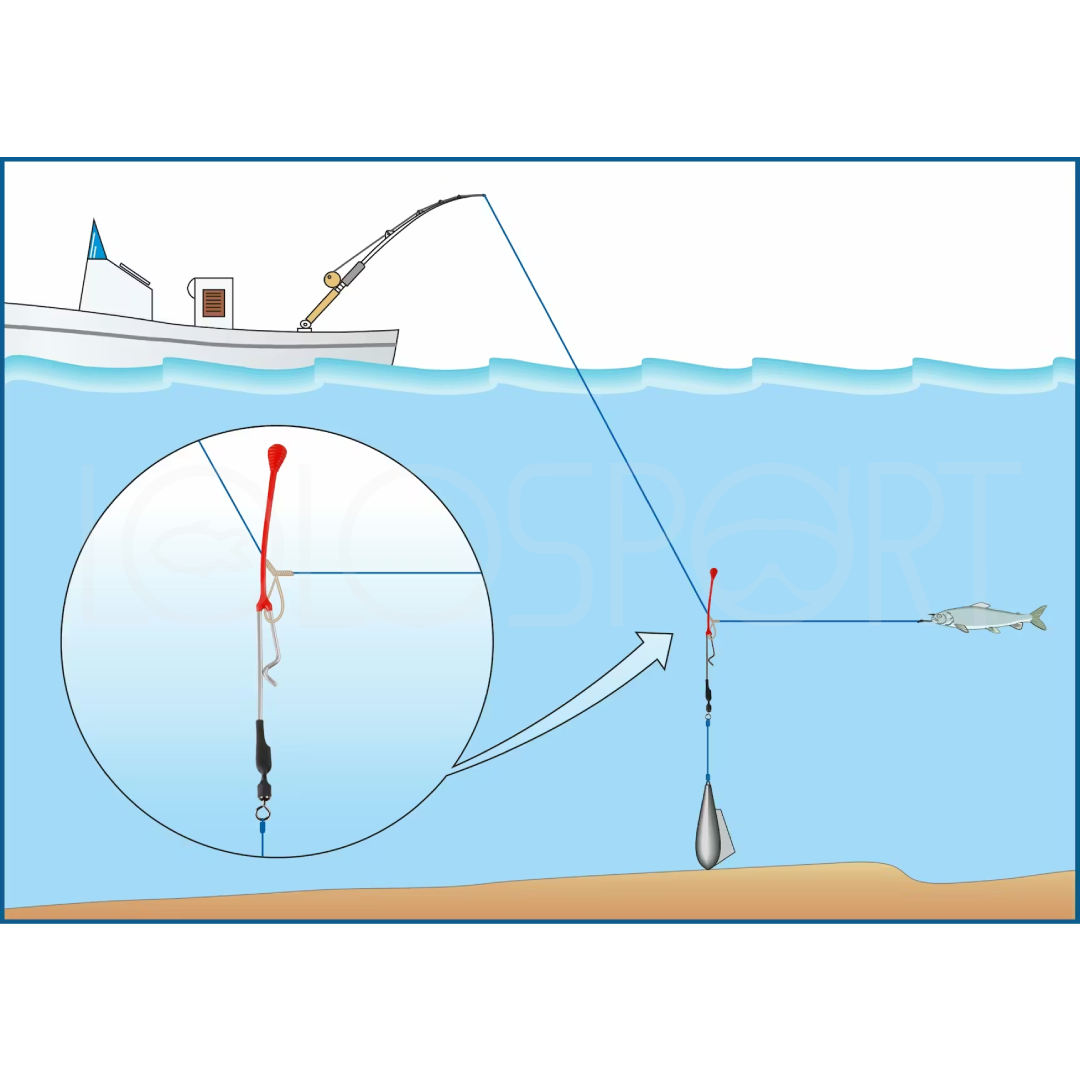 Gancetto in acciaio inox studiato per lo sgancio rapido del piombo guardiano. L’appendice in gomma rossa lo rende ben visibile e ne facilita la presa. Munito di girella integrata.