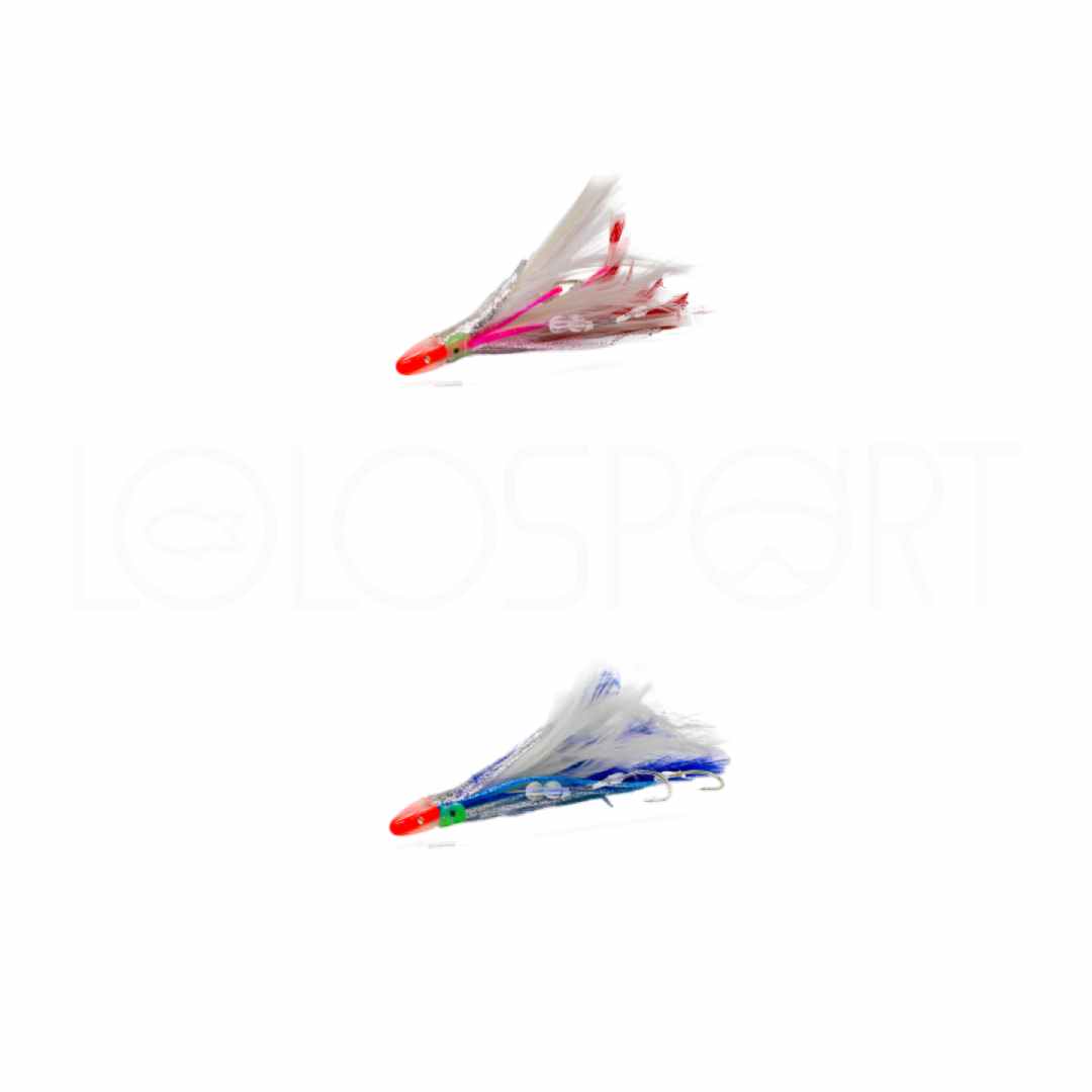 Sugoi Strike Tuna TR1, montatura da traina assemblata con octopus, nylon, rivetti ed ami in acciaio. Indicata per la cattura di prede in superficie e per la traina d’altura. La sue colorazioni con filamenti luminosi risultano un elemento di attrazione per le prede come tunnidi, ricciole, serra e lecce amia.